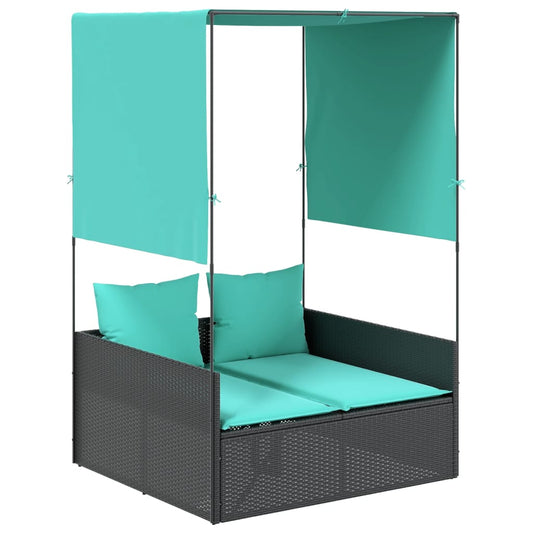 Dubbele ligstoel met dak en gordijnen, zwart polyrotan