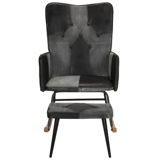 Schommelstoel met voetensteun echt leer en canvas zwart